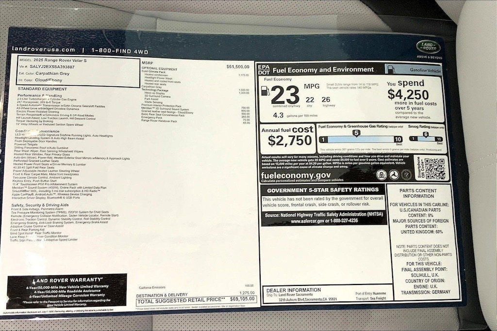 Carpathian Grey Premium Metallic 2025 Land Rover Range Rover Velar S AWD 8-Speed Automatic 2.0L I4 Turbocharged